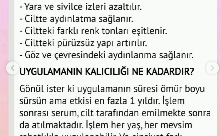 Daha çok kozmetik-dövme sayılabilecek bu işlem sayesinde kaş, göz çizgisi veya dudaklarda doğal cilt renginizle uyumlu etkiler yaratılabileceği gibi bazı ufak kusurlar kapatılabilir. Şekil bozuklukları giderilebilir. Böylece daha düzgün, bakımlı ve genç bir görünüm kazanılabilir.